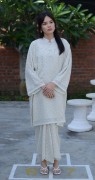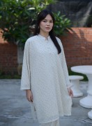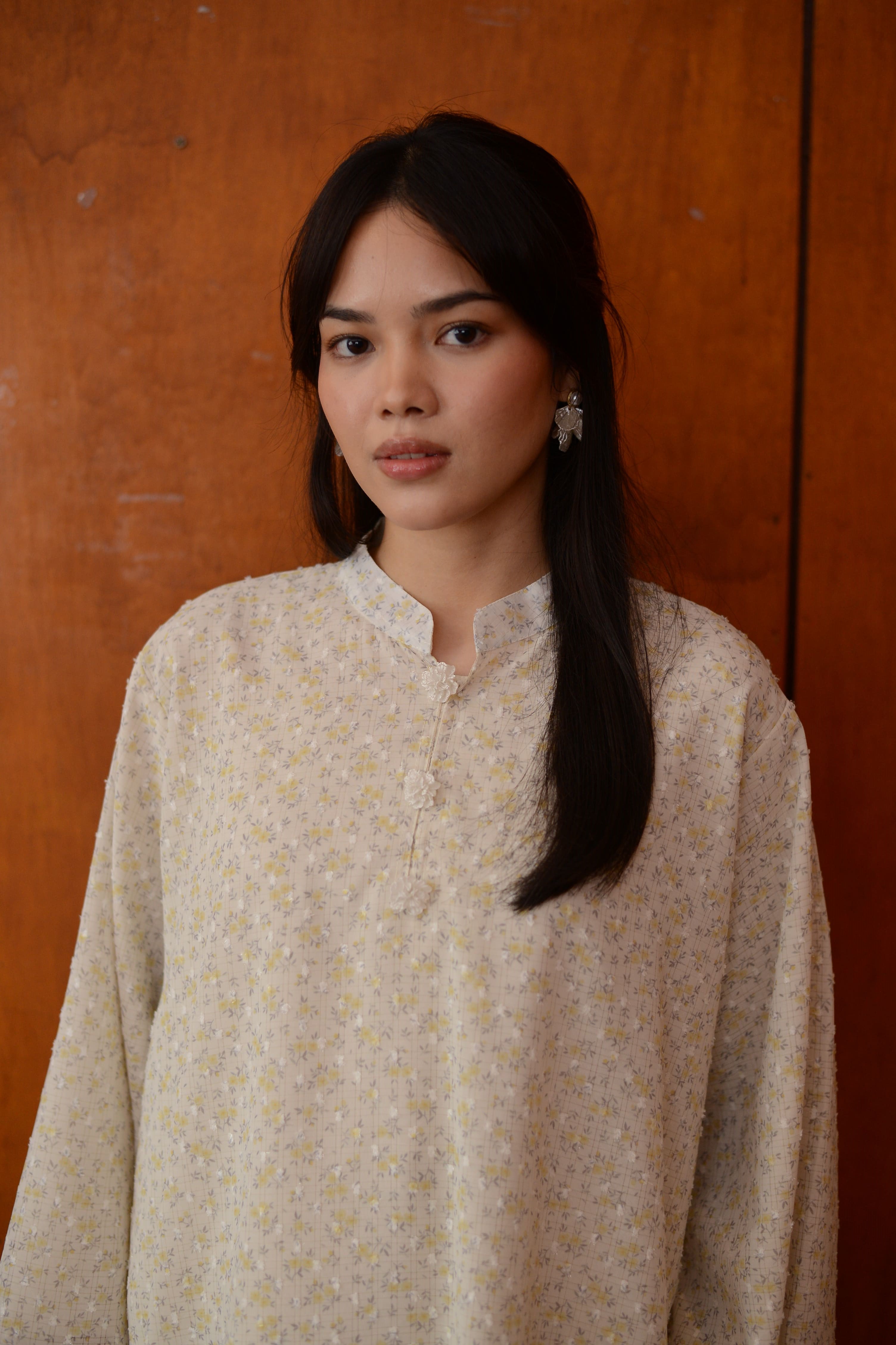 Meet Grace, a timeless mandarin-collar kurung crafted for those who love subtle sophistication. The clean neckline is complemented by a decorative pleated flower, adding a sweet, distinctive touch to the design.