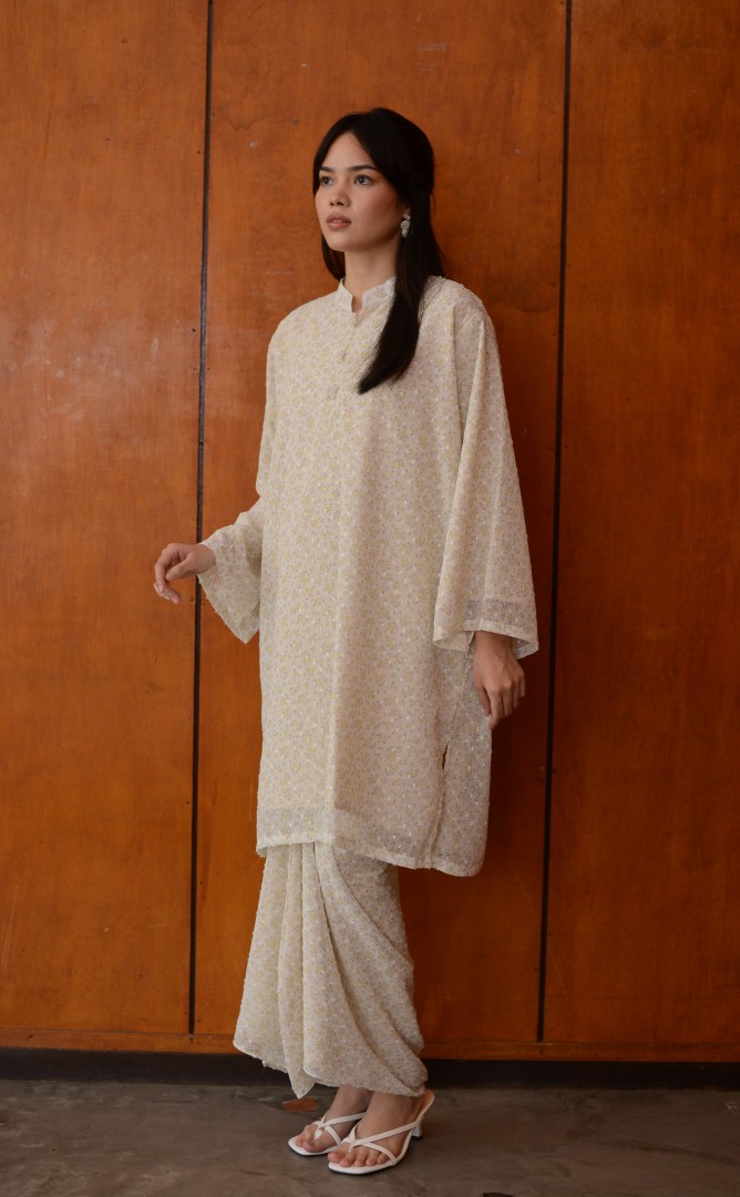 Paired with a tie-knot pareo, Grace balances tradition with modern ease — giving you a look that feels elegant yet effortlessly wearable. Grace is the kind of kurung that makes every occasion feel just a little more special. Classic, refined, and beautifully feminine