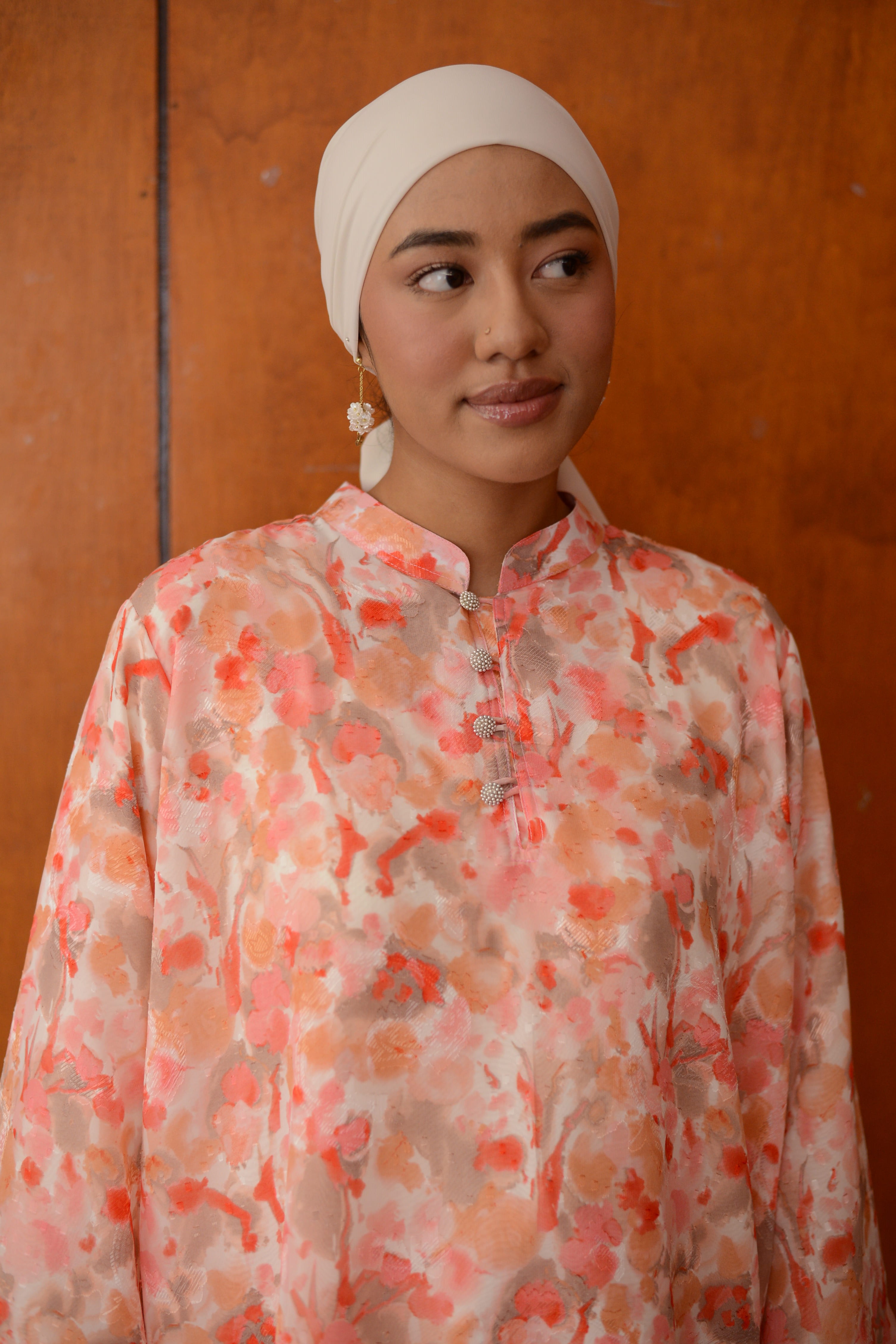 Meet Grace, a timeless mandarin-collar kurung crafted for those who love subtle sophistication. The clean neckline is complemented by a pearl buttons, adding a sweet, distinctive touch to the design.