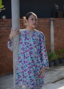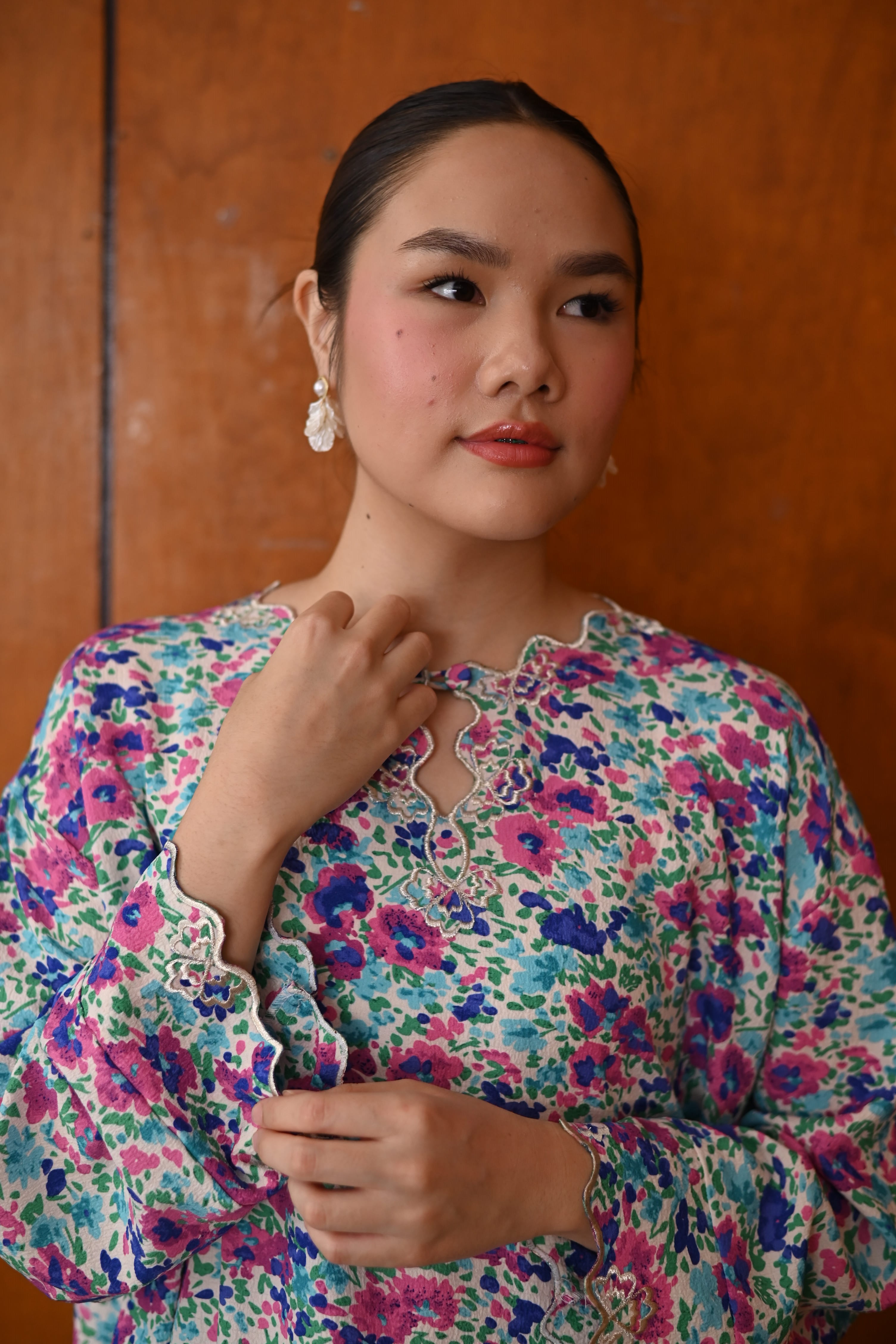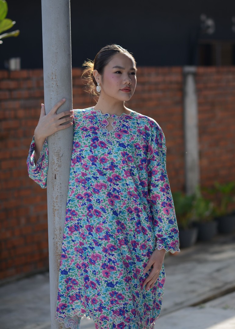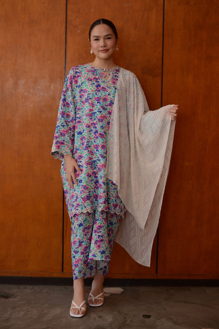 A modern baju kurung featuring a vibrant floral print with a relaxed, flattering silhouette. Designed with exclusive silver hand embroidery along the neckline and front opening, adding a refined shimmer and premium touch. Finished with delicate scalloped detailing, this piece blends contemporary style with timeless elegance. complete the look by pairing Inez with a selendang.