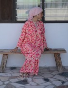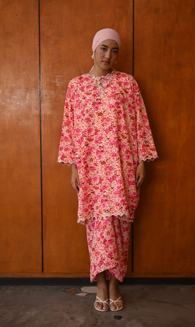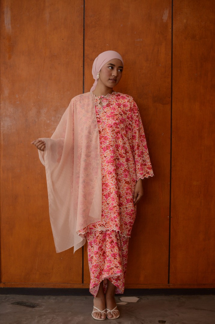 A modern baju kurung featuring a vibrant floral print with a relaxed, flattering silhouette. Designed with exclusive silver hand embroidery along the neckline and front opening, adding a refined shimmer and premium touch. Finished with delicate scalloped detailing, this piece blends contemporary style with timeless elegance. complete the look by pairing Inez with a selendang.