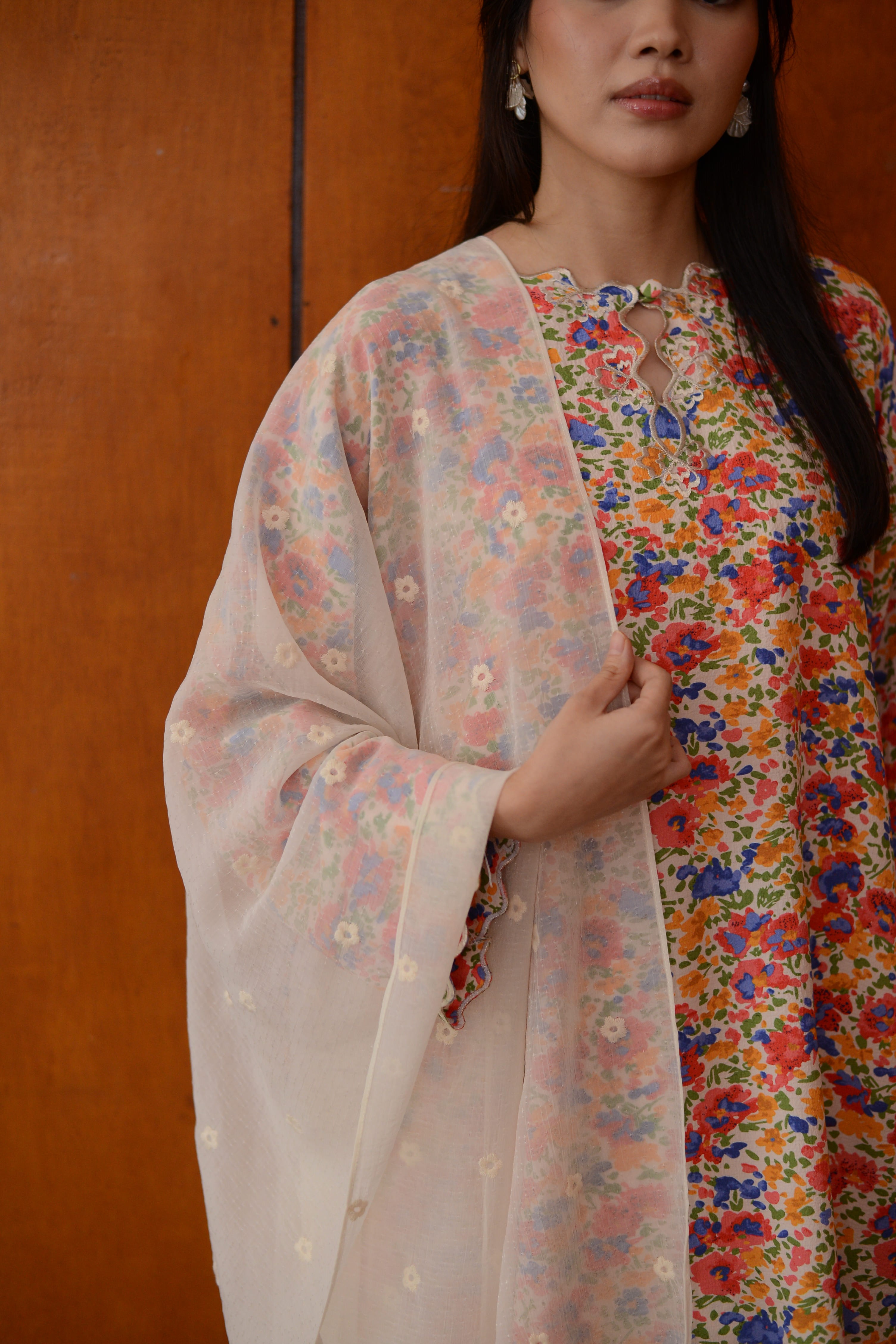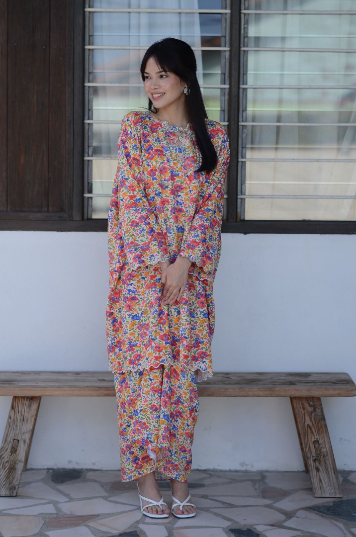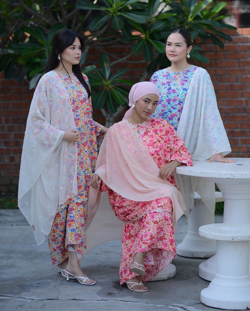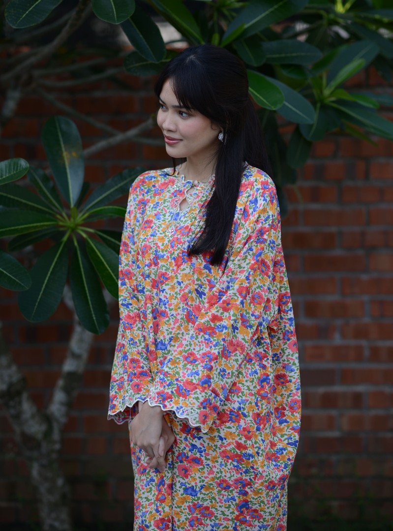 A modern baju kurung featuring a vibrant floral print with a relaxed, flattering silhouette. Designed with exclusive silver hand embroidery along the neckline and front opening, adding a refined shimmer and premium touch. Finished with delicate scalloped detailing, this piece blends contemporary style with timeless elegance. complete the look by pairing Inez with a selendang.