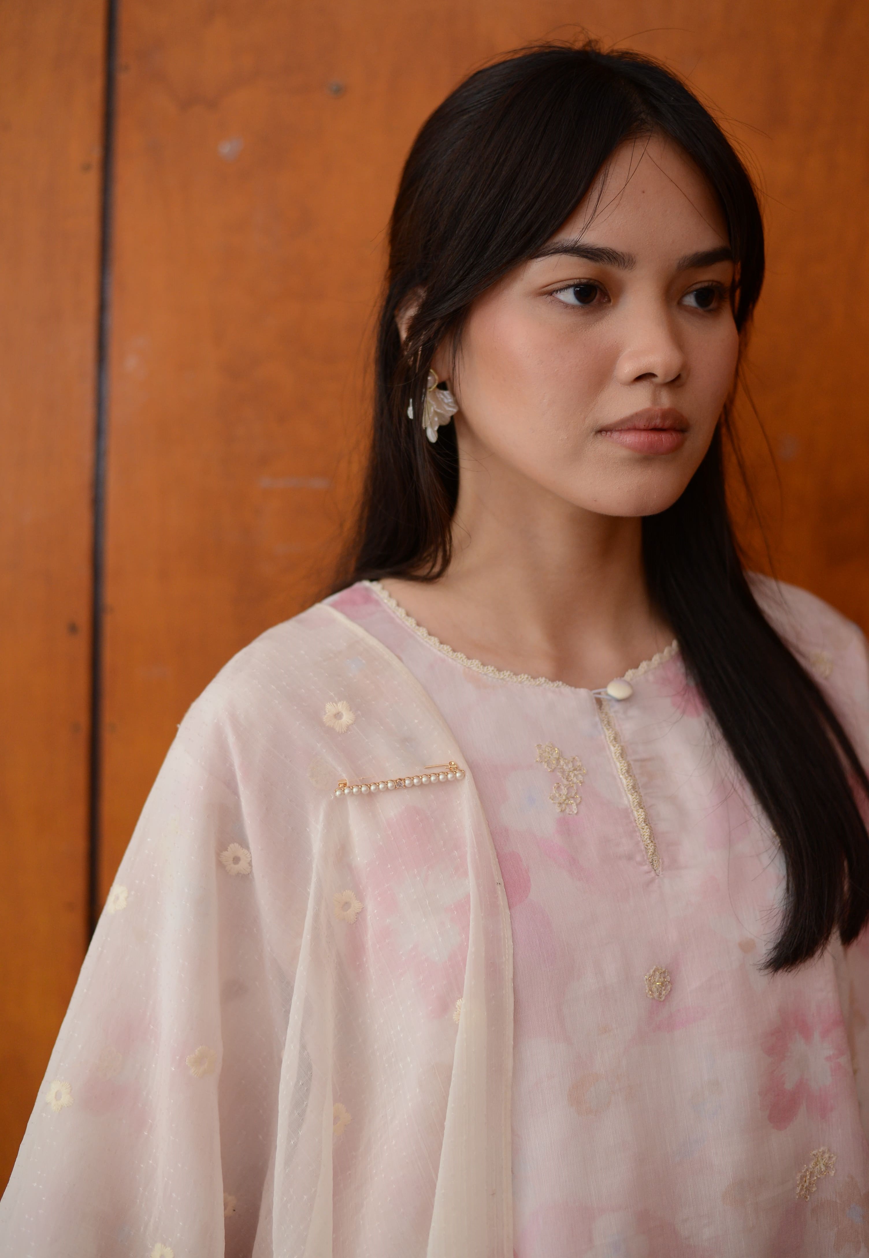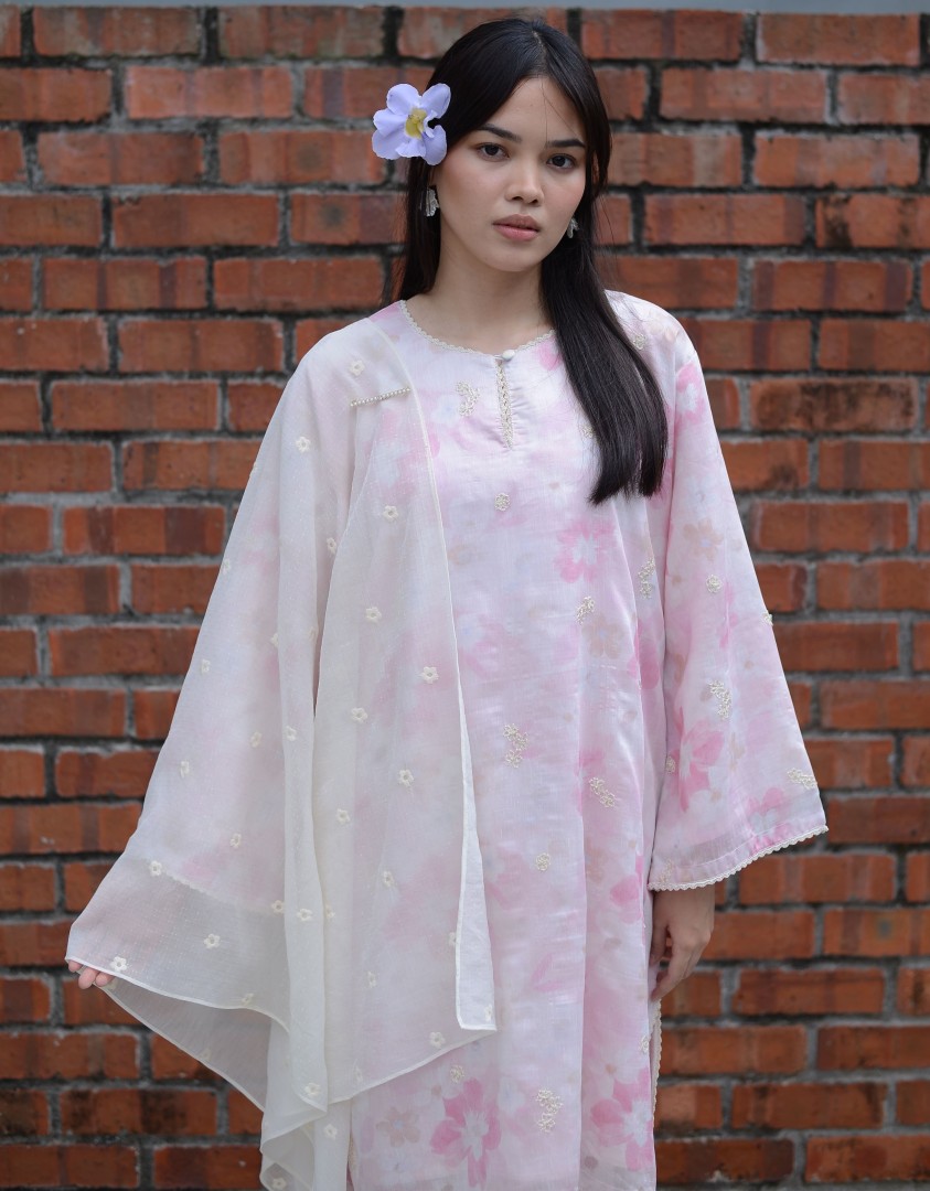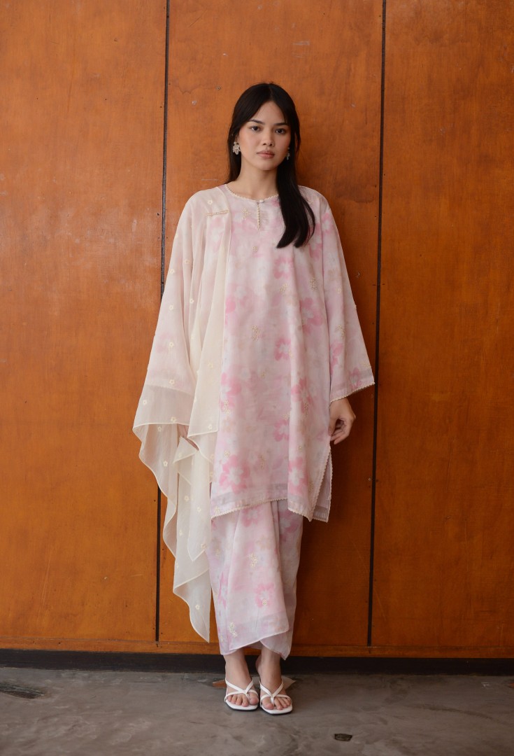 Yara Kurung is thoughtfully elevated with delicate scallop lace trimmings and cotton embroidered floral motifs, softly accented with a hint of gold. Made from breathable, silky-soft tencel and fully lined with lightweight cotton, it offers beautiful drape, comfort, and effortless elegance.