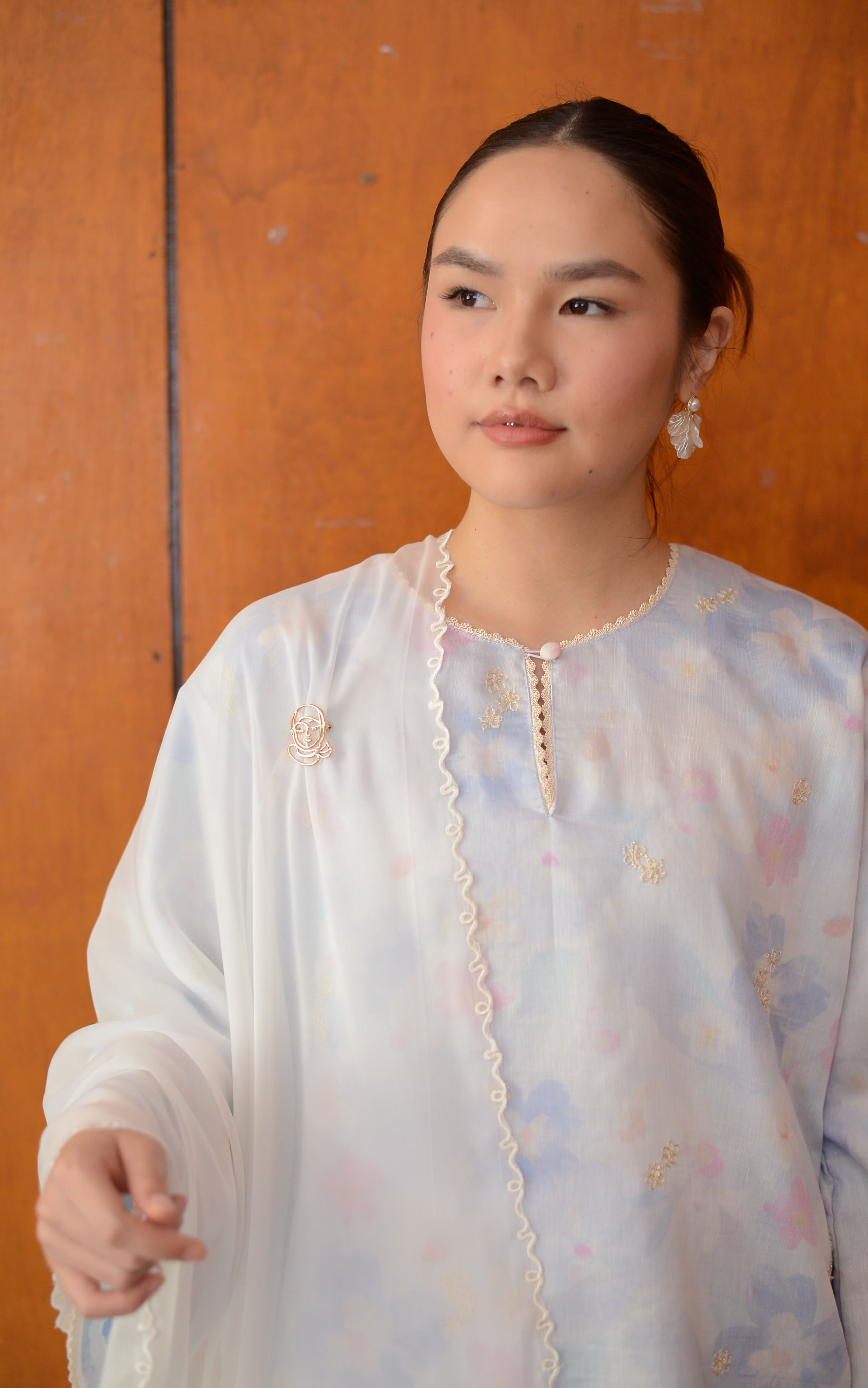 Yara Kurung is thoughtfully elevated with delicate scallop lace trimmings and cotton embroidered floral motifs, softly accented with a hint of gold. Made from breathable, silky-soft tencel and fully lined with lightweight cotton, it offers beautiful drape, comfort, and effortless elegance.