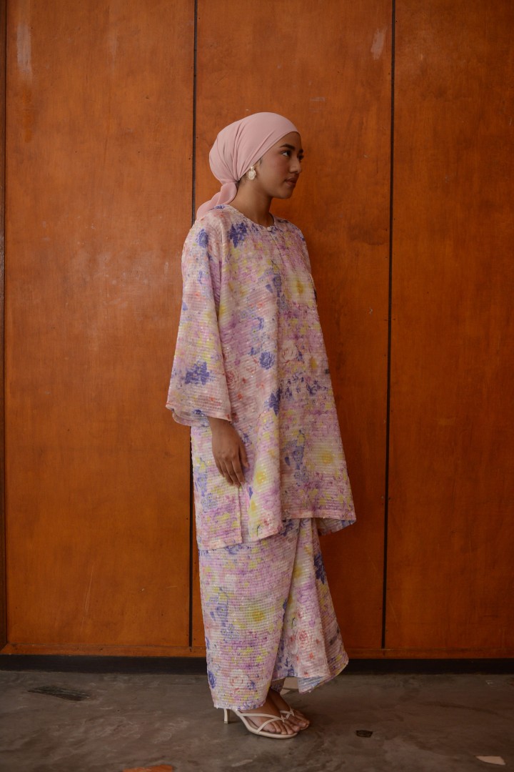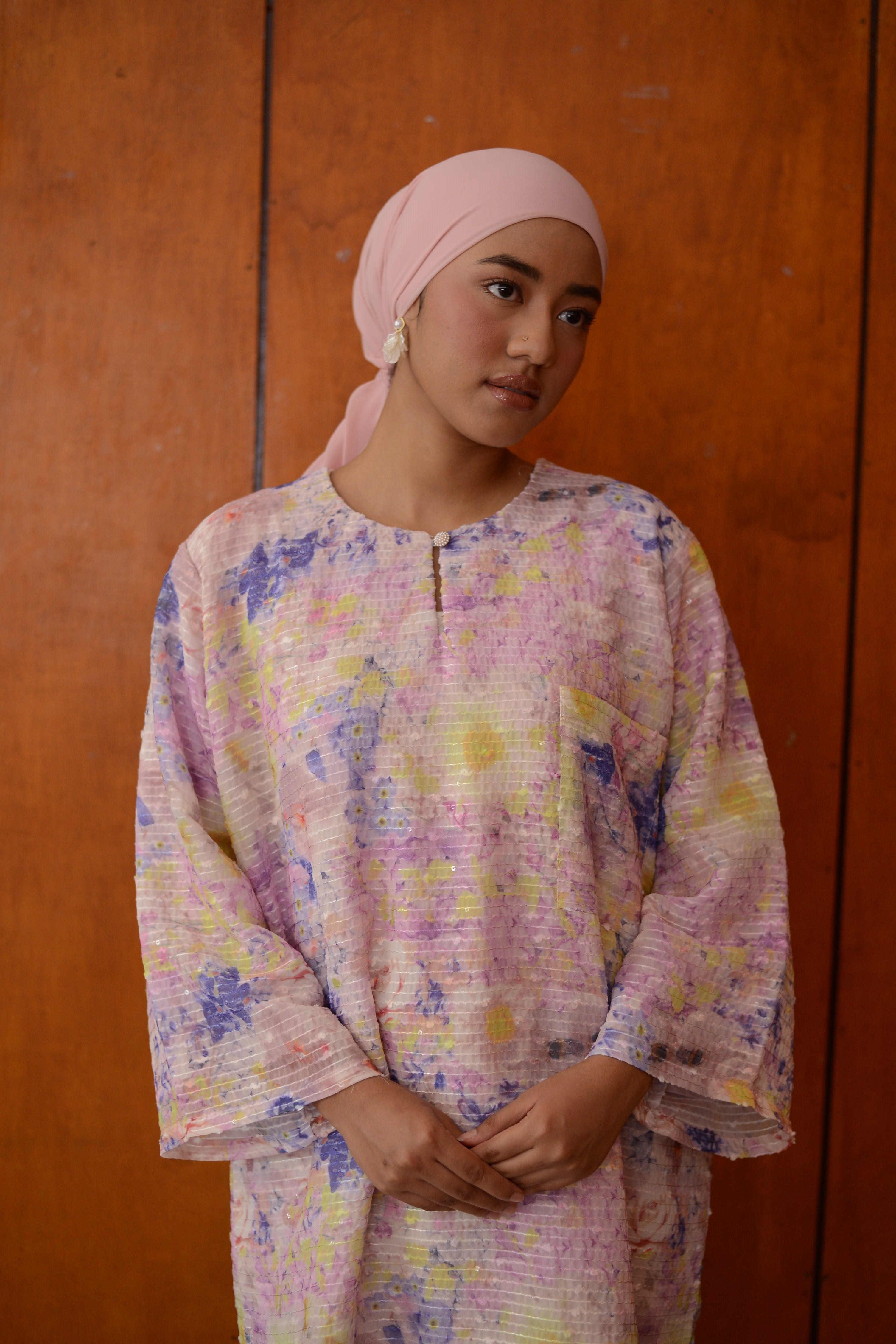 Kurung Oversized Zahra features delicate sequins that shimmer softly with every movement, paired with a graceful tie-knot pareo for a flattering drape. Inspired by the 1950s kurung, the classic pocket detail adds nostalgia and charm